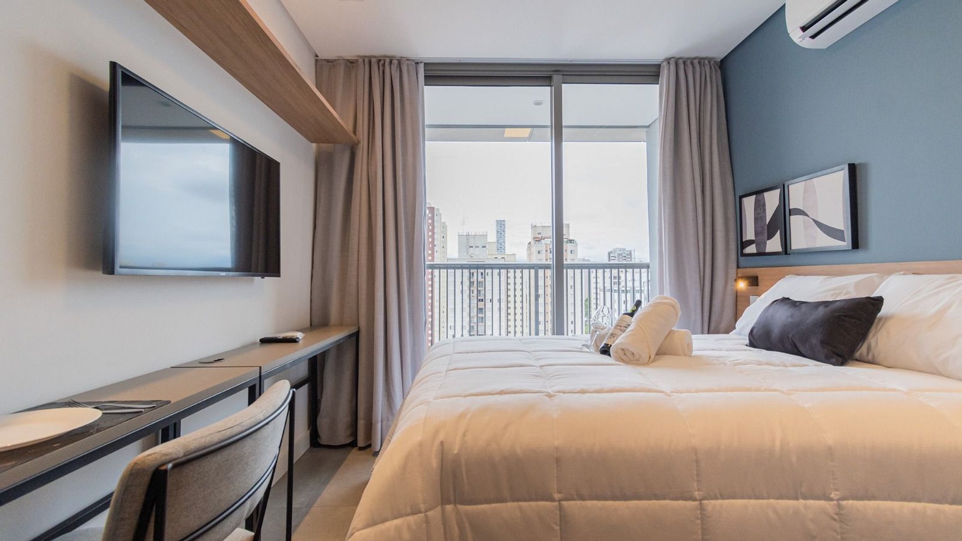 Situado no 13º andar, o apartamento oferece uma varanda que proporciona uma vista deslumbrante da cidade, perfeita para momentos de relaxamento. O ambiente é bem aproveitado, contando com uma aconchegante cama de casal, ideal para garantir boas noites de sono.